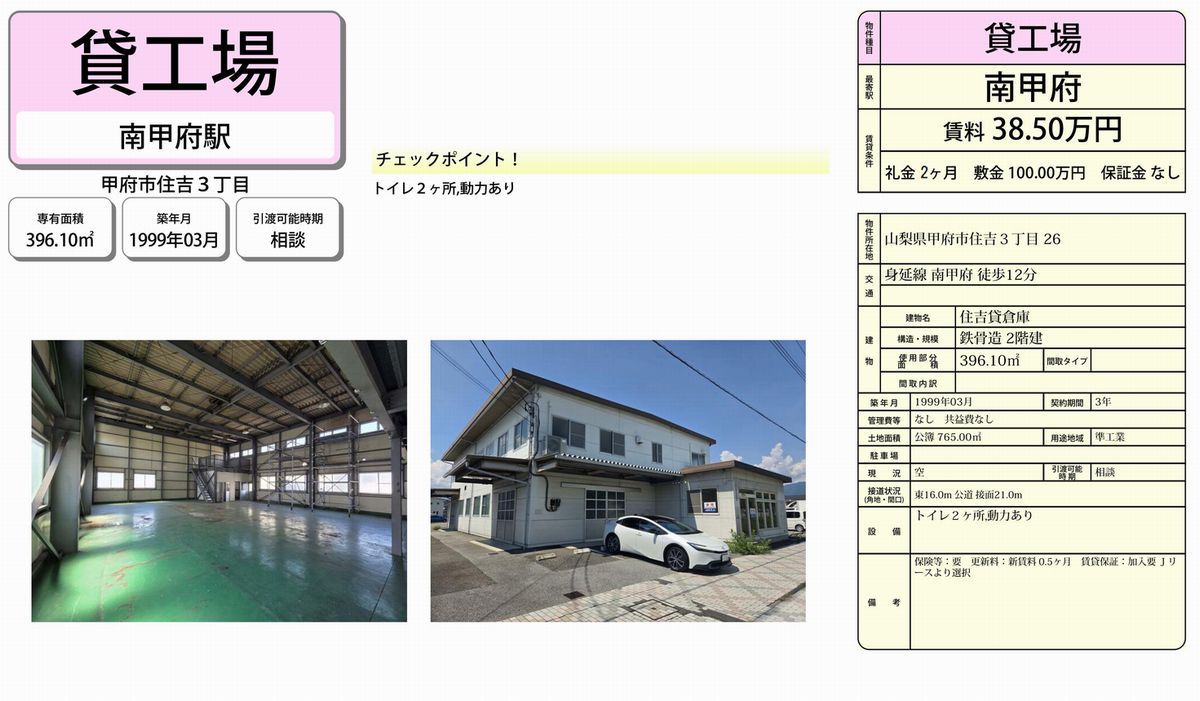 甲府市住吉3-26(山梨県)の貸倉庫・貸工場・貸地をはじめ山梨全域の貸し倉庫・貸し工場・貸し土地を検索できます。甲府市住吉3-26(山梨県)の事務所付貸倉庫、クレーン付工場、店舗倉庫、工業専用地域等、ニーズに合わせて簡単検索。甲府市住吉3-26(山梨県)の貸し倉庫・貸し工場・貸地を貸したい方にはオーナーサポートシステムで無料にて査定・掲載いたします。甲府市住吉3-26(山梨県)で貸倉庫・貸工場・貸し土地をご契約のテナント様には貸し倉庫・貸し工場の設計変更、造作のご相談・施工も承ります。貸倉庫・貸工場・貸地で移転・新規開設をするなら山梨地区最大級のテナント.com!