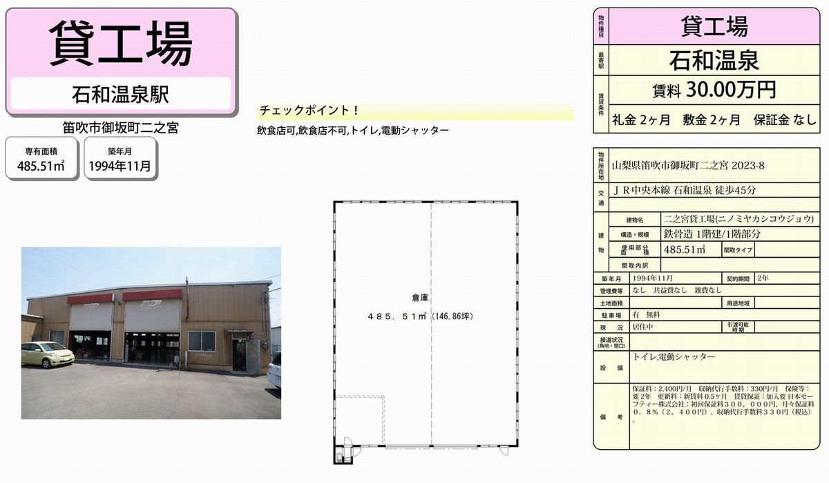 笛吹市御坂町二之宮2023-8 (石和温泉) 二之宮貸工場 詳細データ