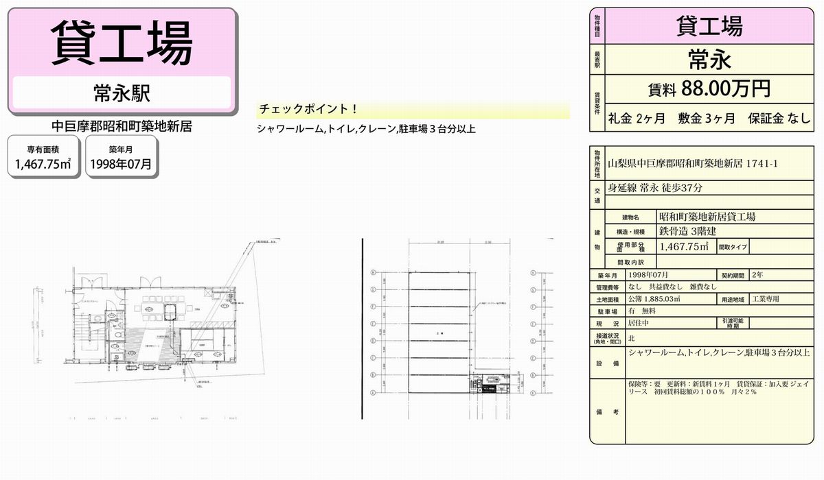 中巨摩郡昭和町築地新居1741-1 (身延) 常永 貸工場 詳細データ